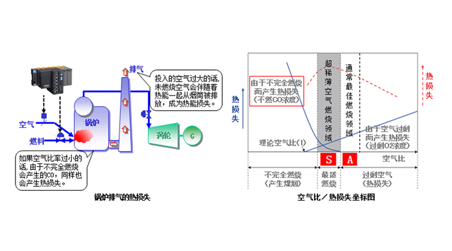 ◆鍋爐是將燃料和空氣投入到爐內,使之燃燒而產(chǎn)生熱能的裝置。針對當時(shí)的燃料而投入的空氣比率(空氣比)過(guò)大的話(huà),未燃燒空氣會(huì )伴隨著(zhù)熱能一起從煙筒被排放,成為熱能損失(排氣熱能損失)。相反,如果空氣比率過(guò)小的話(huà),由于不完全燃燒會(huì )產(chǎn)生的CO,同樣也會(huì )產(chǎn)生熱損失。產(chǎn)生熱能損失的話(huà),如同生產(chǎn)蒸氣一樣需要相應的鍋爐燃料(燃料費)會(huì )增加。